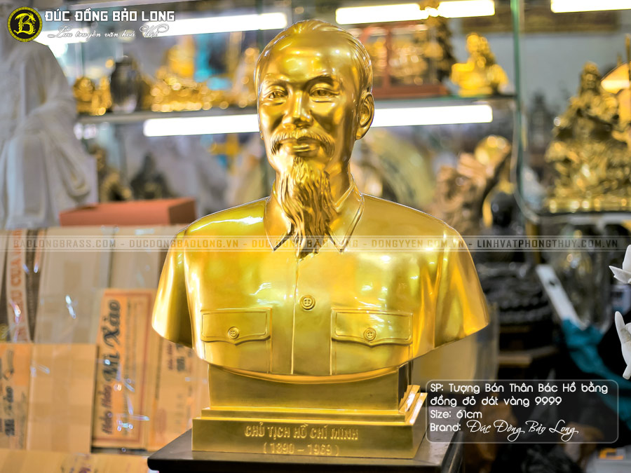 Quý khách đang được chiêm ngưỡng mẫu Tượng Bác Hồ bán thân bằng Đồng Đỏ cao 6 tấc - 61cm cực đẹp. Đây là mẫu tượng có hình khối và thần thái chuẩn được chính các nghệ nhân của xưởng Đúc Đồng Bảo Long tạo dựng và chế tác hoàn thiện
