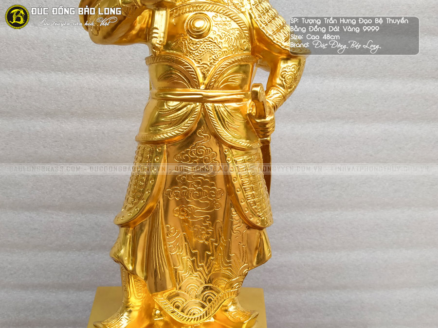 Phiên bản Tượng Đồng Trần Hưng Đạo bệ thuyền dát vàng 9999 cao gần 5 tấc - 48cm được các nghệ nhân Đúc Đồng Bảo Long tâm huyết tạo dựng. Ròng rã suốt 02 năm lên ý tưởng và trải qua hơn 3 tháng chế tác, chúng tôi lần đầu tiên đem đến thị trường mẫu tượng đồng mang dấu ấn thời gian.